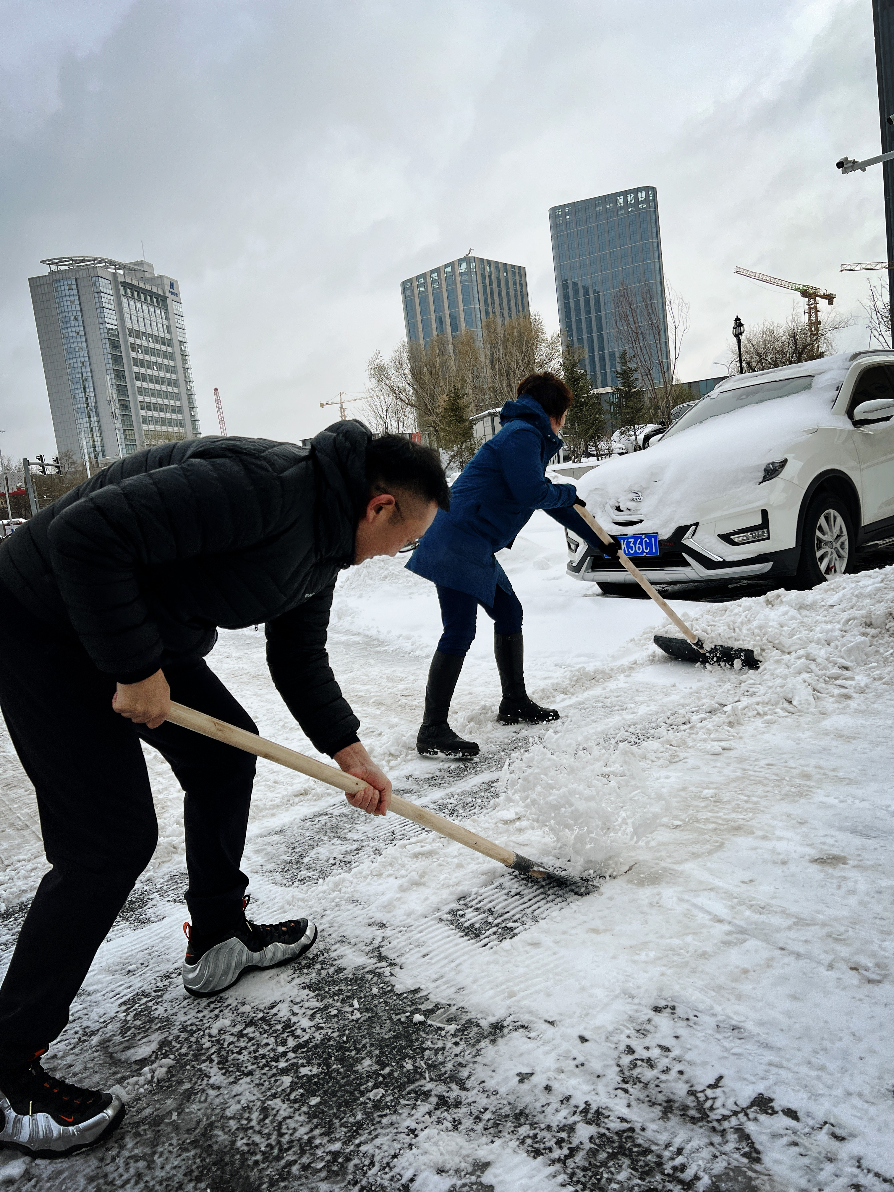 办公地点水务楼地处校园外东南角,大楼东北向有一个面积较大的停车场。进入11月以来,持续的强降雪天气为交通和出行带来极大不便,学校机械化扫雪队伍第一时间照顾不到这里,地面清雪全靠大楼内的保安和物业人员。行政教工党支部注意到清雪人力物力不足、人员长期劳作身体疲惫的情况,11月11日上午组织党员对水务楼门前积雪进行了清扫。