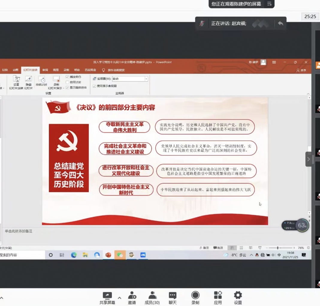最后,赵宾福总结道,党的十九届六中全会,对建党百年以来的很多问题进行了解答,比如说分期问题、成就问题、百年经验总结问题、百年奋斗的历史意义问题、新时代情况下历史性成就与历史性变革问题、指导思想的三次飞跃等问题,全部回答得清清楚楚,具有强烈的现实意义,在党的未来历史上,也一定是一个具有重大转折意义、载入史册的会议。决议对党在100年间走过的路、取得的成绩、积累的经验,都非常科学准确地进行了解读和概括,对于我们这些在下一个百年、在实现中华民族伟大复兴新征程上如何再去做出一些新的贡献的人来说,具有长期的指导意义。