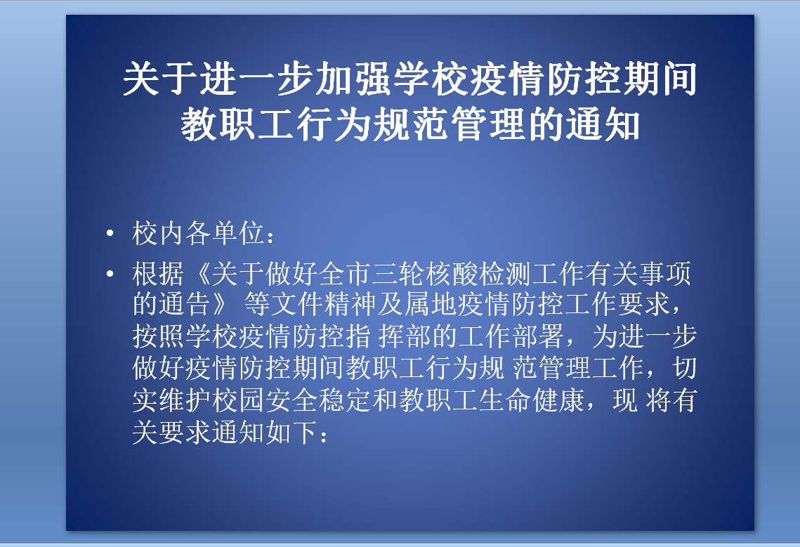 副书记兼副院长/纪委书记侯建峰传达了学校疫情防控指挥部和教职工排查及流调工作组下发的《关于进一步加强学校疫情防控期间教职工行为规范管理的通知》。