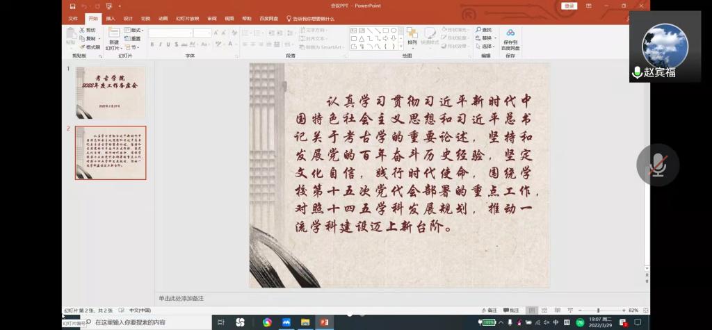 赵宾福做了点评并进行了总结。赵宾福讲到,时值疫情防控的重要时期,学院要抓好疫情防控和线上教学两条线的工作,确保各项工作不出问题。目前国家和学校都对考古学科倾注了很大的心血,黄色视频