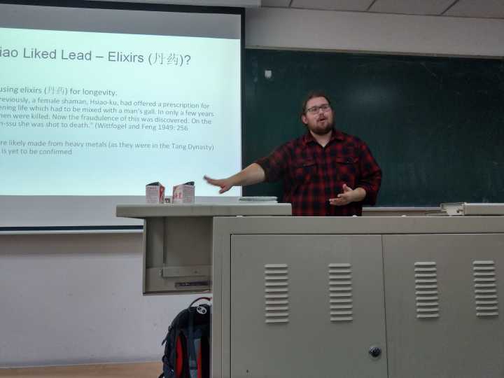 沙龙正式开始后,罗斯-谢菲尔德首先介绍在一些国家(新西兰,加拿大等)的发掘注意事项,并结合他自身在这些国家发掘的亲身体验进行分享。他通过直观的对比条目让在场的同学们了解了各个国家考古发掘的异同之处。接下来,他开始了对于辽代陶瓷铅中毒的研究介绍。首先他用通俗的语言介绍了人类为何喜欢铅及其化合物,其次介绍了铅对人体的危害。再从辽代人喜欢铅制品,金银及丹药这一史实入手,简要地讲述了辽代的人们对铅的喜爱,最后切回正题,讲述他的研究发现——辽代陶瓷的釉彩中的铅含量严重超标,对人体的健康存在危害,这些铅对当时的人们及其后代的影响仍是未知的,尚待进一步研究。最后,在罗斯-谢菲尔德介绍科学研究涉及到的方法论,回答完同学们的问题后,沙龙在轻松愉快的气氛中结束。