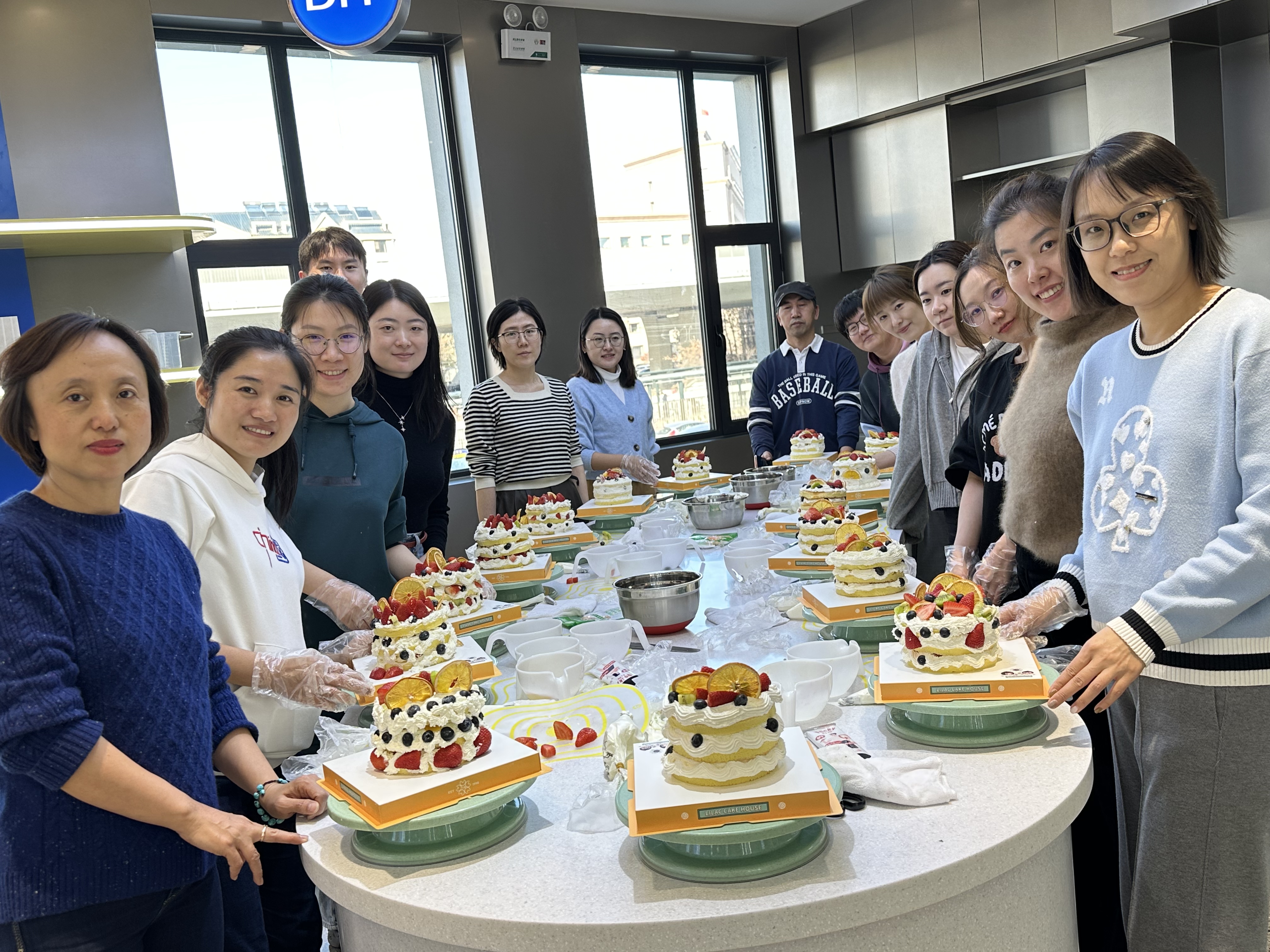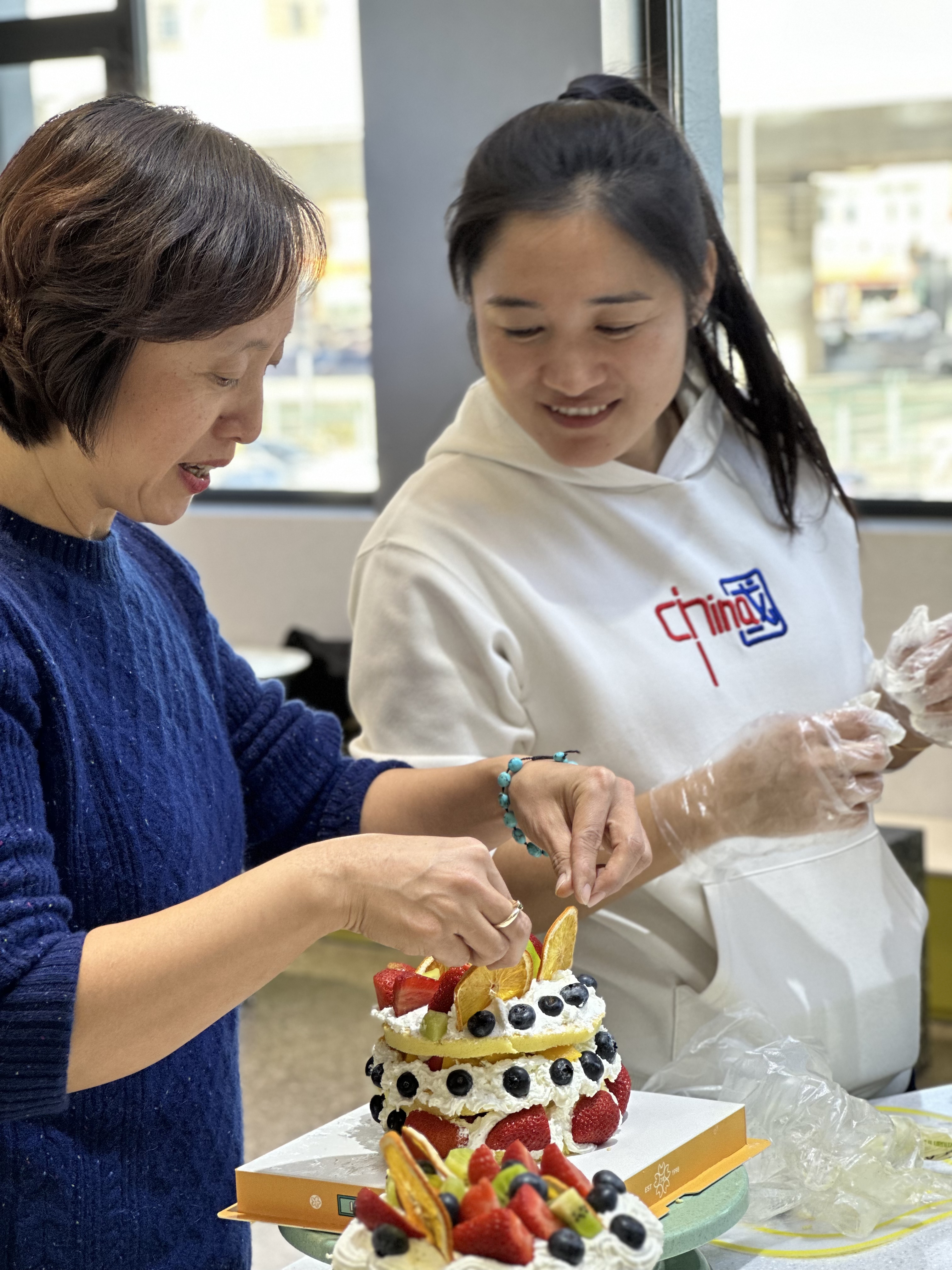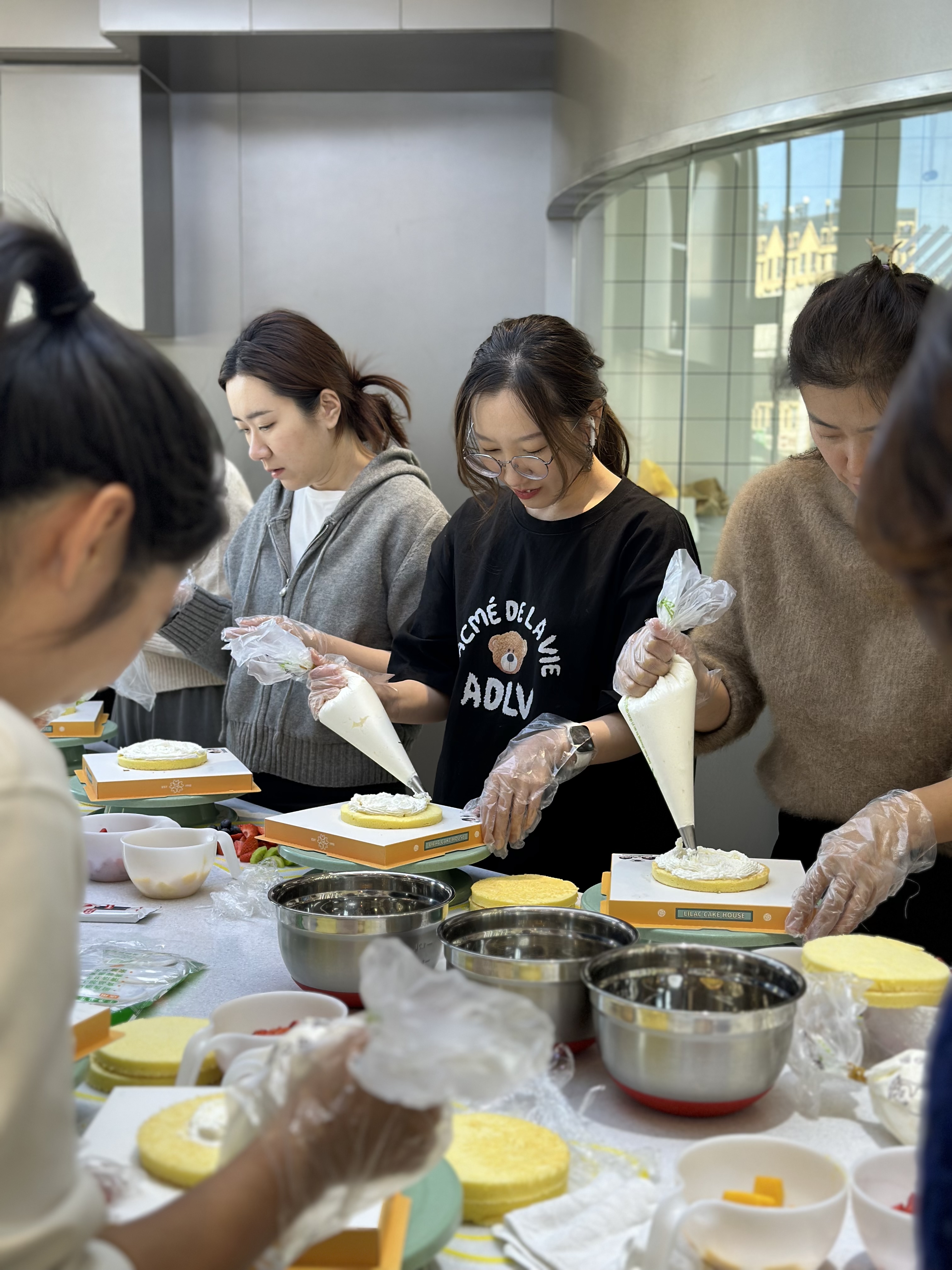 精心挑选烘焙场地与食材,最终确定离校园最近方便大家出行的丁香西饼屋(国泰店)。烘焙活动当天,丁香西饼屋的西点师向大家介绍了要做的蛋糕类型、用料和操作用具,一边细心讲解制作方法,一边现场操作,大家迫不及待地跟随着步骤亲自动手,在蛋糕胚上涂抹奶油、摆放水果,欣赏各自的作品并拍照留念,现场充满了欢声笑语。