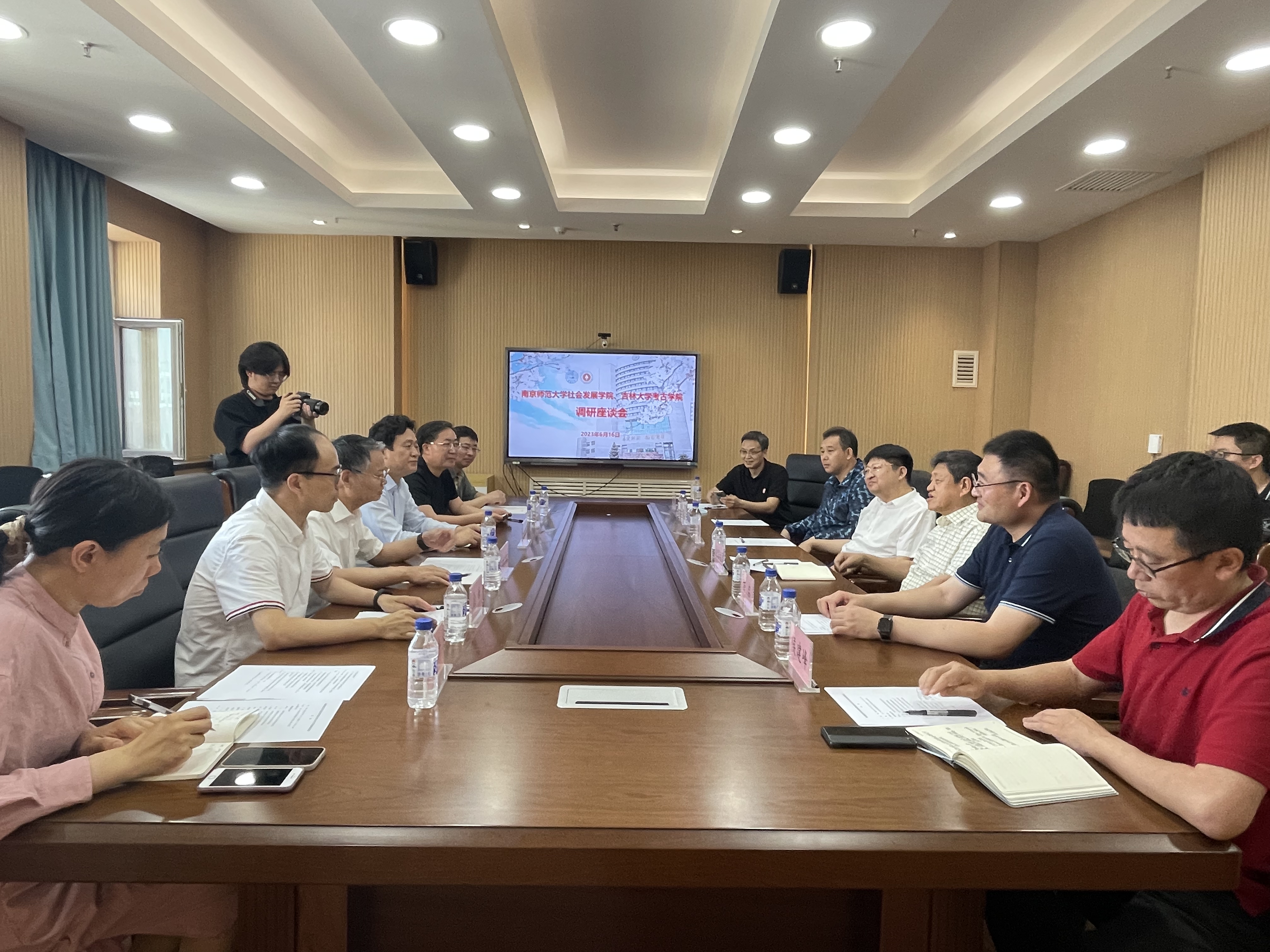 的热情接待表示感谢,并简要介绍了南京师范大学社会发展学院的基本情况。随后,双方就建设和发展田野考古教学实习实践基地、科技考古实验室、高水平考古学博士后流动站、高素质师资队伍、师德师风与意识形态、服务国家与地方社会等方面,以及考古学、博物馆学本科和研究生课程设置及培养方案,培育高层次科研项目及科研成果,学科建设与人才培养国际化等方面进行了深入交流。