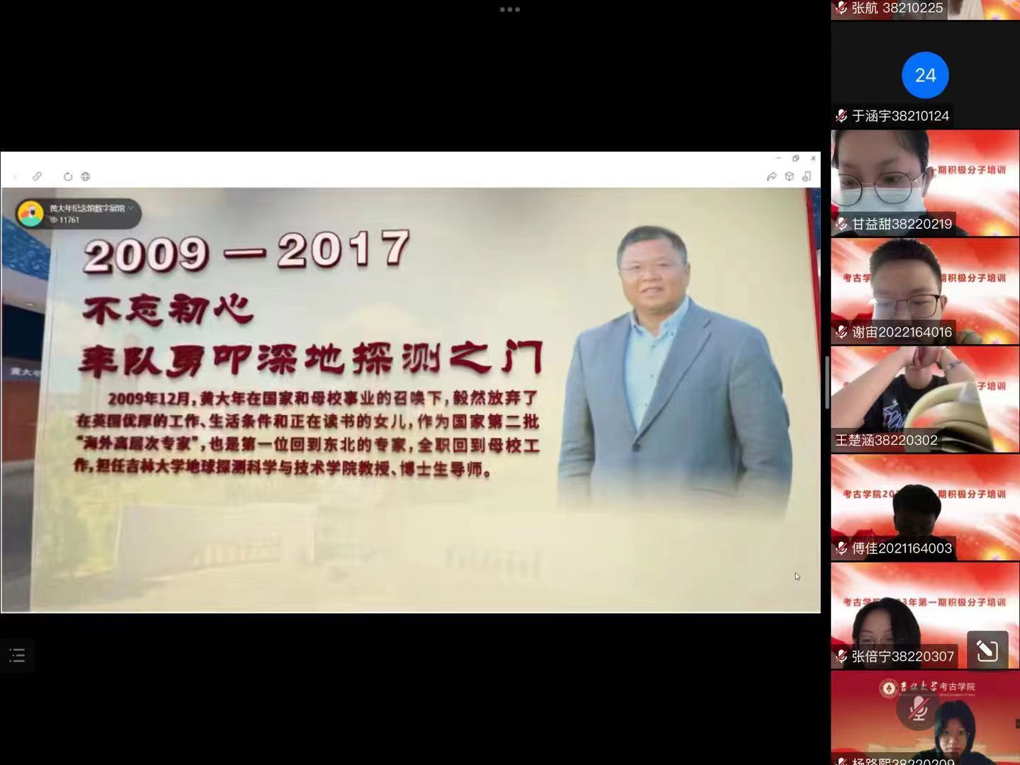 的建校历程,回顾学校七十多年来在学科建设、人才培养和科技创新等各个方面取得的丰硕成果,鼓励与会人员成长为信念坚定、廉洁自律、敢于担当的合格党员。最后,与会人员线上参观了黄大年纪念馆和校史馆。