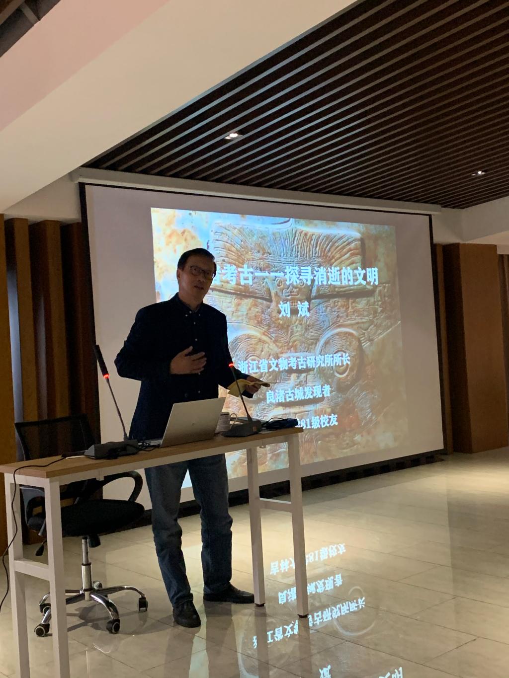 1981级校友刘斌在良渚考古与保护中心报告厅为师生们做题为《良渚考古——探寻消逝的文明》讲座,介绍良渚古城遗址发掘过程,普及良渚文化。