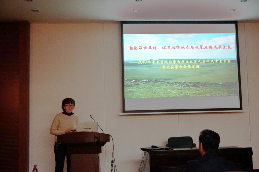 潘玲老师进行朝伦昂古其特、塔黑拉嘎地点石板墓发掘成果汇报