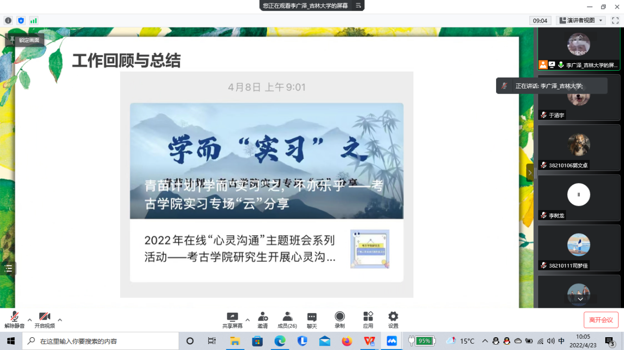 会议共有三项议程,即工作回顾、志愿者情况总结以及换届工作安排。会议伊始,李广泽首先对一个月以来学生会各部门的工作进行了回顾与总结。他以学生会主办的系列活动如“青苗计划”系列讲座、“考古K歌之王”歌会等为典型案例,做了详细介绍。同时对工作中出现的问题作了两处强调:一是邀请科研学术部负责人王路遥结合近期工作经验,对通讯稿写作中常见的问题进行了总结;二是对活动进行过程中,学生会同学在组织和传达工作方面中的应具备的明确性和时效性提出了要求。