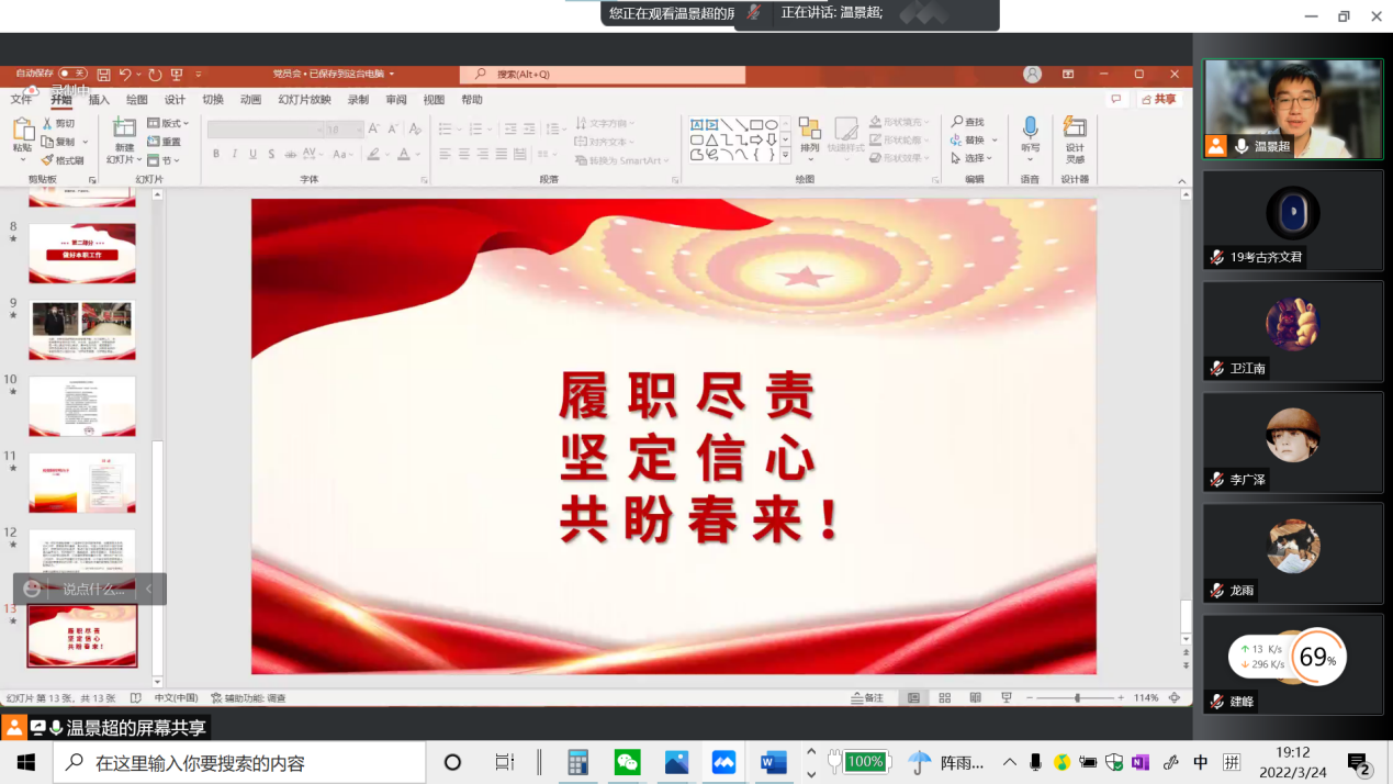 疫情防控期间工作要求》。她讲到,作为学生党员,应该发挥先锋模范作用,各位党员同学要和每位同学保持紧密联系,大家应竭尽全力帮助同学解决相关问题。同时,疫情期间,大家仍要以学习为重,认真学习贯彻习近平总书记关于《全面加强历史文化遗产保护的重要指示精神》,自觉肩负使命,争取更大光荣。希望每个党员同志履职尽责,坚定信心,共盼春来。