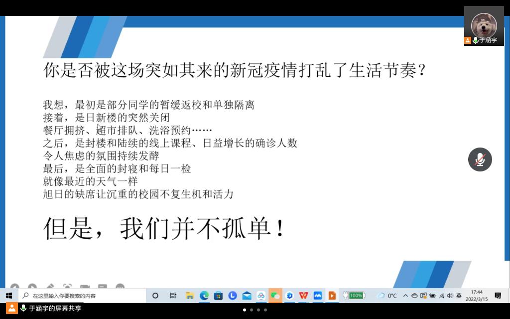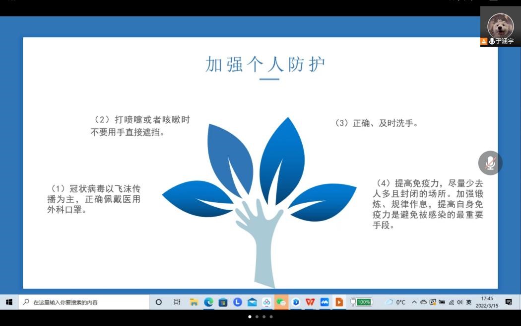 2021级一班以“疫情下的我们”为切入点召开了主题班会。会议旨在展示学校人文关怀、宣传线上活动,呼吁同学理性对待疫情。长春疫情发生以来,我班同学积极响应学校号召,在全民抗疫的形势下,不添乱不增负,严格遵循防疫需求,减少人员接触,做好个人防护。在线上课程学习中,我班同学努力认真,不缺课不漏课,完成老师布置的教学任务,不因为线上学习就有所松懈,积极向上,努力成长成才。不仅如此,我班同学还踊跃报名志愿服务,帮忙发放寝室物资,为抗击疫情尽自己的一份力,培养了互帮互助的友好氛围,树立了家国情怀和责任担当意识。