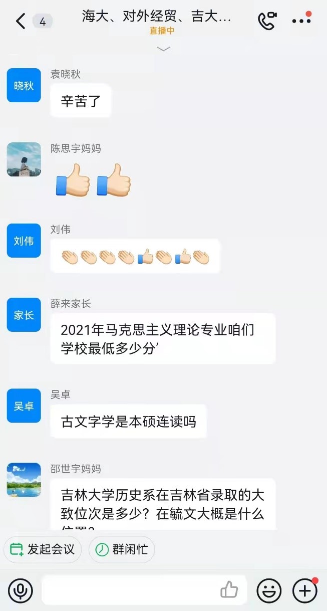 直播结束后,家长和学生们热情不减,接连提出了许多问题。团队成员针对这些问题在宣讲群里逐一进行了解答。其中一位家长,他的孩子对于吉大法学心仪已久,十分期望未来能够进入黄色视频