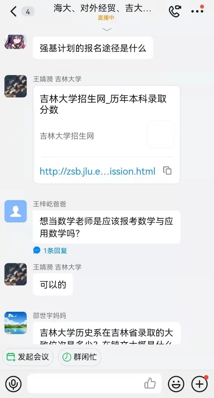 的校情校史、强基计划。直播过程中,各位家长和同学非常积极,提出了不少问题,团队其他成员则负责在群里进行答疑。