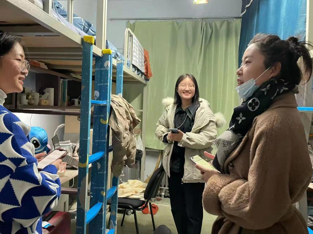 走访过程中,老师们问询了同学们在寒假期间的学习与实践经历,了解了学生的假期生活和思想动态,关心了同学们的返校防疫情况,并核验了同学们的通信行程卡、核酸检测证明等材料。期间,老师们仔细查看了学生宿舍的环境卫生和用电安全等方面情况,叮嘱同学们要遵守学校的住宿规定,提高安全用电意识。同时要求大家遵循开学期间学校的疫情防控要求,做好个人防护和每日健康监测工作,合理安排作息时间,认真学习,营造积极健康的宿舍文化等。此外,老师们重点走访了毕业年级宿舍,了解他们的思想动态、毕业规划及考研情况,针对同学们存在的困惑与迷惘,提出了中肯的建议与指导,增添了毕业生找工作、升学的信心。