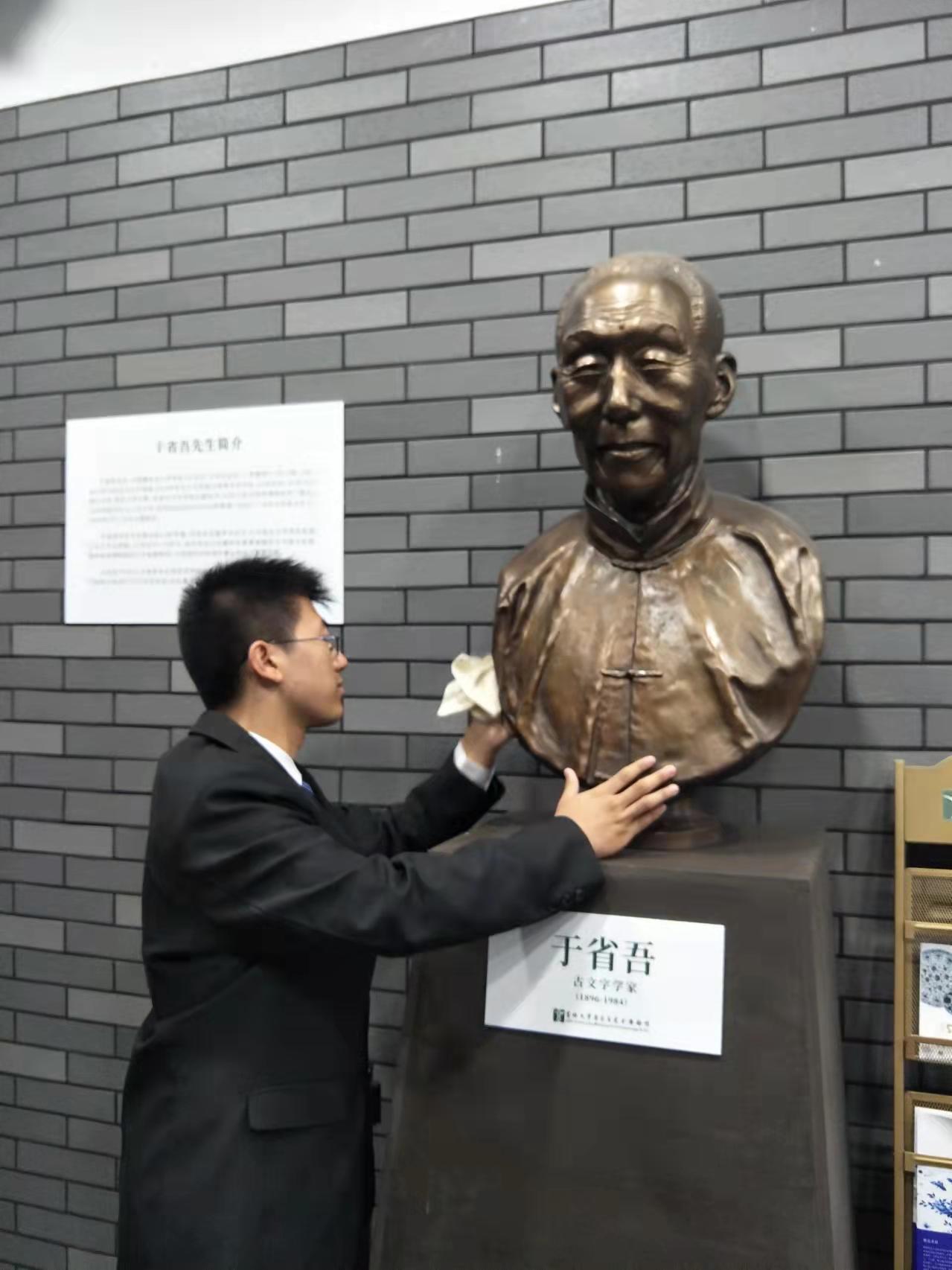 上午10时,各位学生代表怀着无比崇敬的心情来到考古与艺术博物馆,聚集在吉大先贤于省吾先生的雕像前,举行庄重的祭扫雕像仪式。首先,张馨予同学代表学生发言,认真梳理了吉大的优秀文化基因和思想精华,深切追思于省吾先生在中国古文字、古器物研究和古籍整理研究领域的卓越成就与伟大贡献,并自勉继承先贤遗志,发扬先贤精神。随后,同学们自发而有序地清扫了于省吾先生的雕像,用实际行动表达了自己的崇敬与缅怀之情。最后,学生代表果香凝同学向于省吾先生的雕像敬献花束,全体同学鞠躬并肃立默哀,表达对先贤的无尽敬仰与深切追思之情。