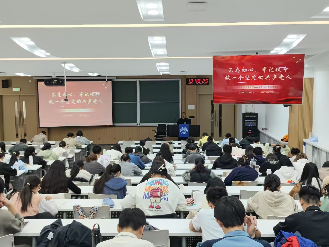 党委、院关工委邀请学校关工委驻会委员王成果老师于11月1日下午,在逸夫教学楼第四阶梯教室开展了主题为“不忘初心,牢记使命,做一个坚定的共产党人”的讲座。讲座由院团委书记马嘉男老师主持,2024级全体本科生、研究生参加。