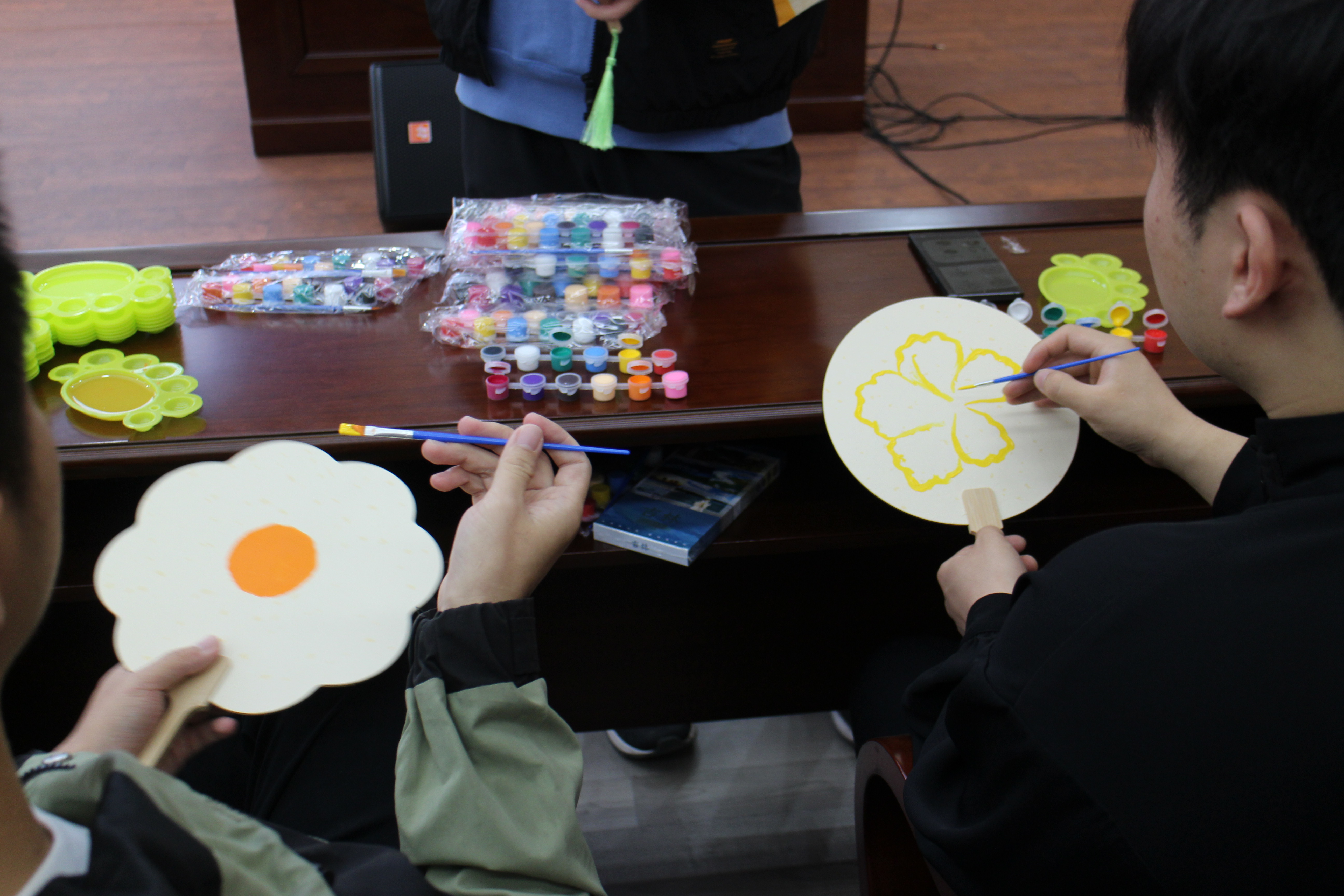 团扇绘制环节则让大家沉浸在创作的宁静与美好中。同学们以扇为纸,以笔寄情,绘制出各式各样独具特色的团扇作品。每一笔勾勒、每一抹色彩,不仅展现了同学们的巧思与才情,更承载着大家对中秋文化的理解与情感的寄托。