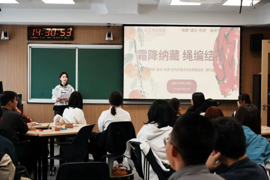 本次活动特邀吉林省省级非遗绳编代表性传承人,吉林省高级工艺师徐晓雪老师,为同学们系统讲解绳编的起源、发展与当代创新,并带领大家学习编织“双钱结”。徐老师细致演示、耐心指导,让大家在指尖流转中体悟绳编所承载的文化精神与非遗保护的重要意义。
