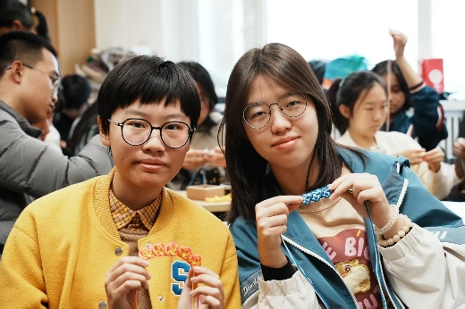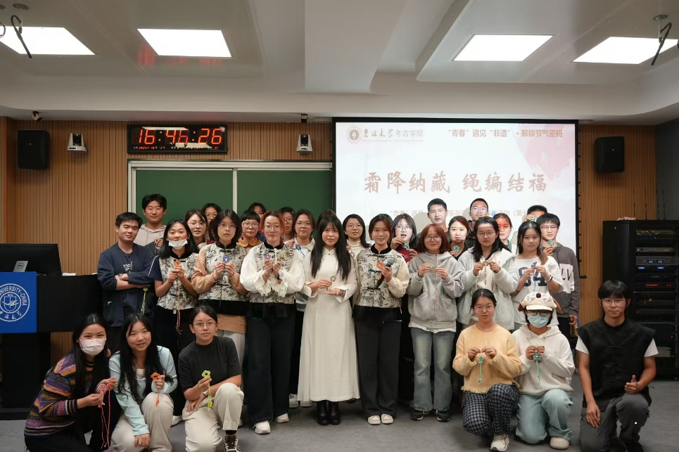 在编织的静谧时光里,我对“霜降纳藏”有了更深地理解。霜降,是收敛与沉淀的时节,为的是积蓄能量,以待来年勃发。而我们学习绳结的过程,也是一种“纳藏”。一根柔韧的丝绳,通过不同的穿插、缠绕,便能形成如此稳固而美丽的结构,承载起厚重的祝福。这次活动,让我在方寸绳结间,感受到了传统的温度。这不仅是一场知识的传递,更是一次文化的共鸣。交流互动中,文化认同如纽带般将同学们的青春之心紧密相连,为非遗传承注入源源不断的青春力量。