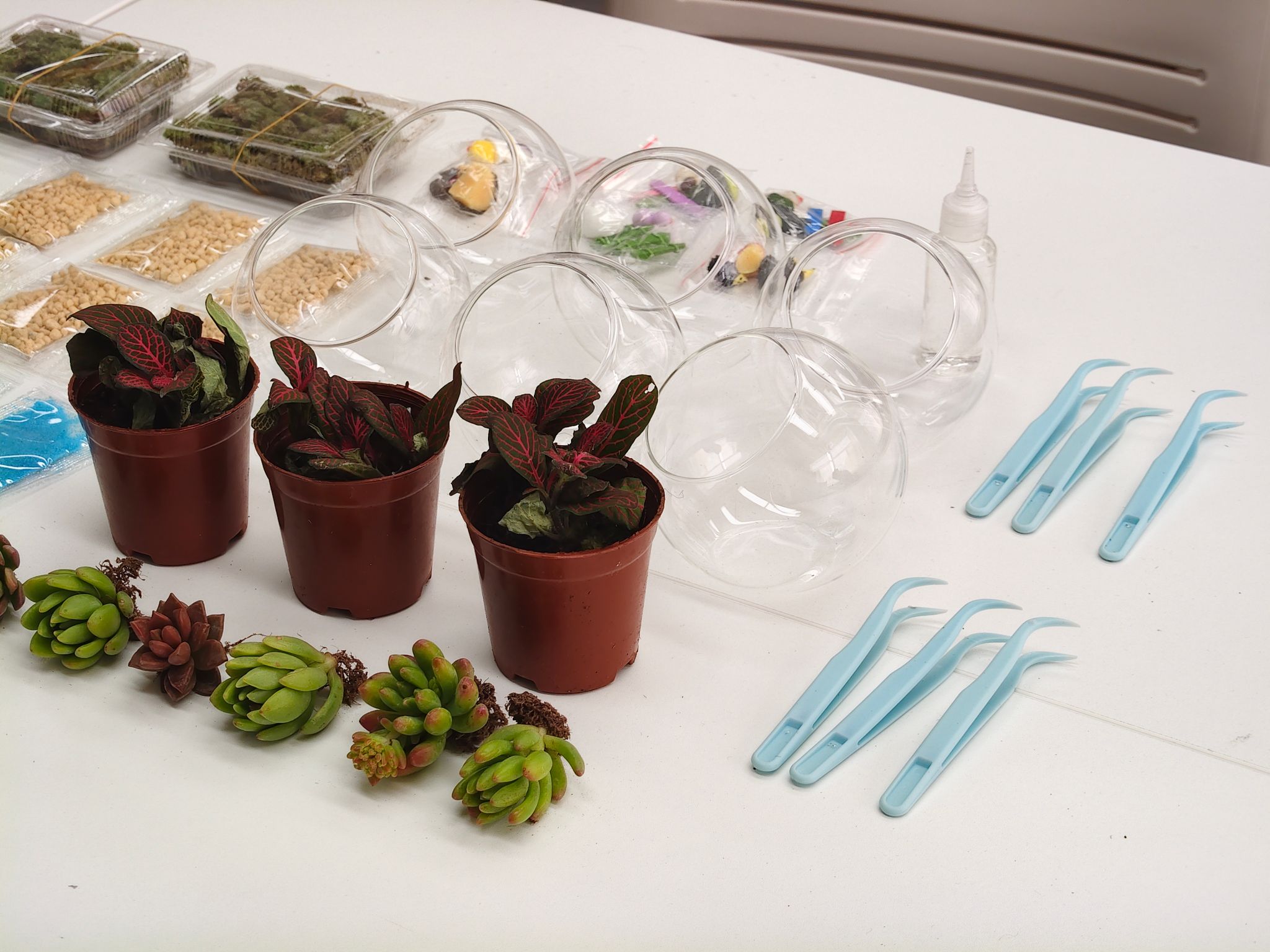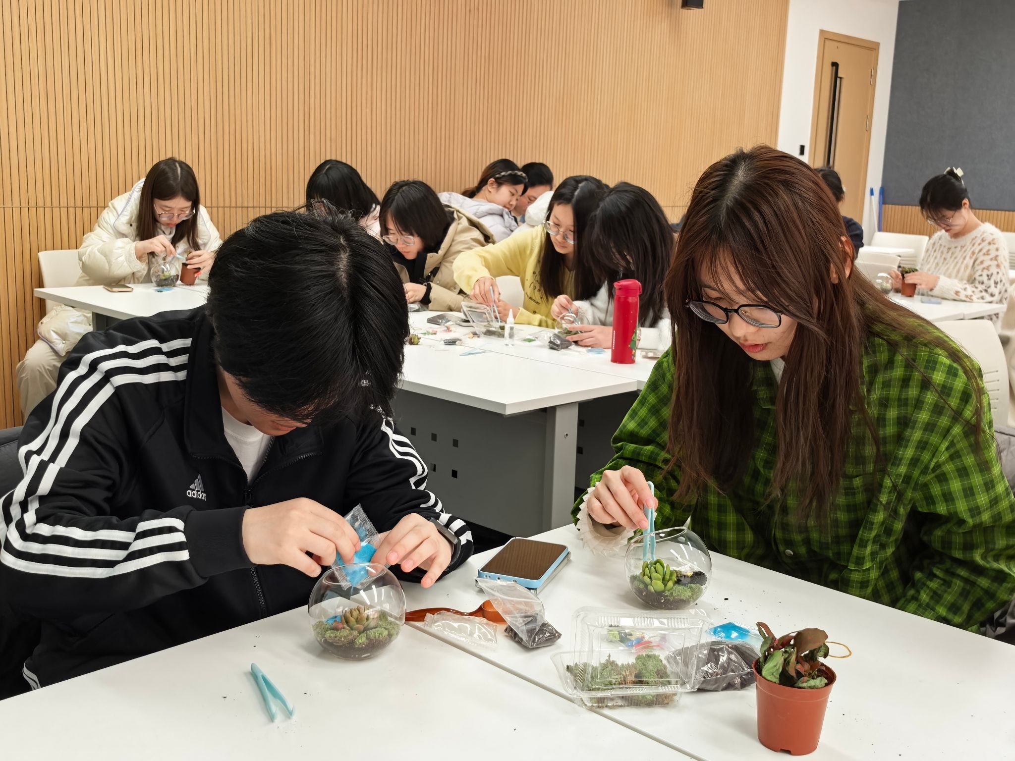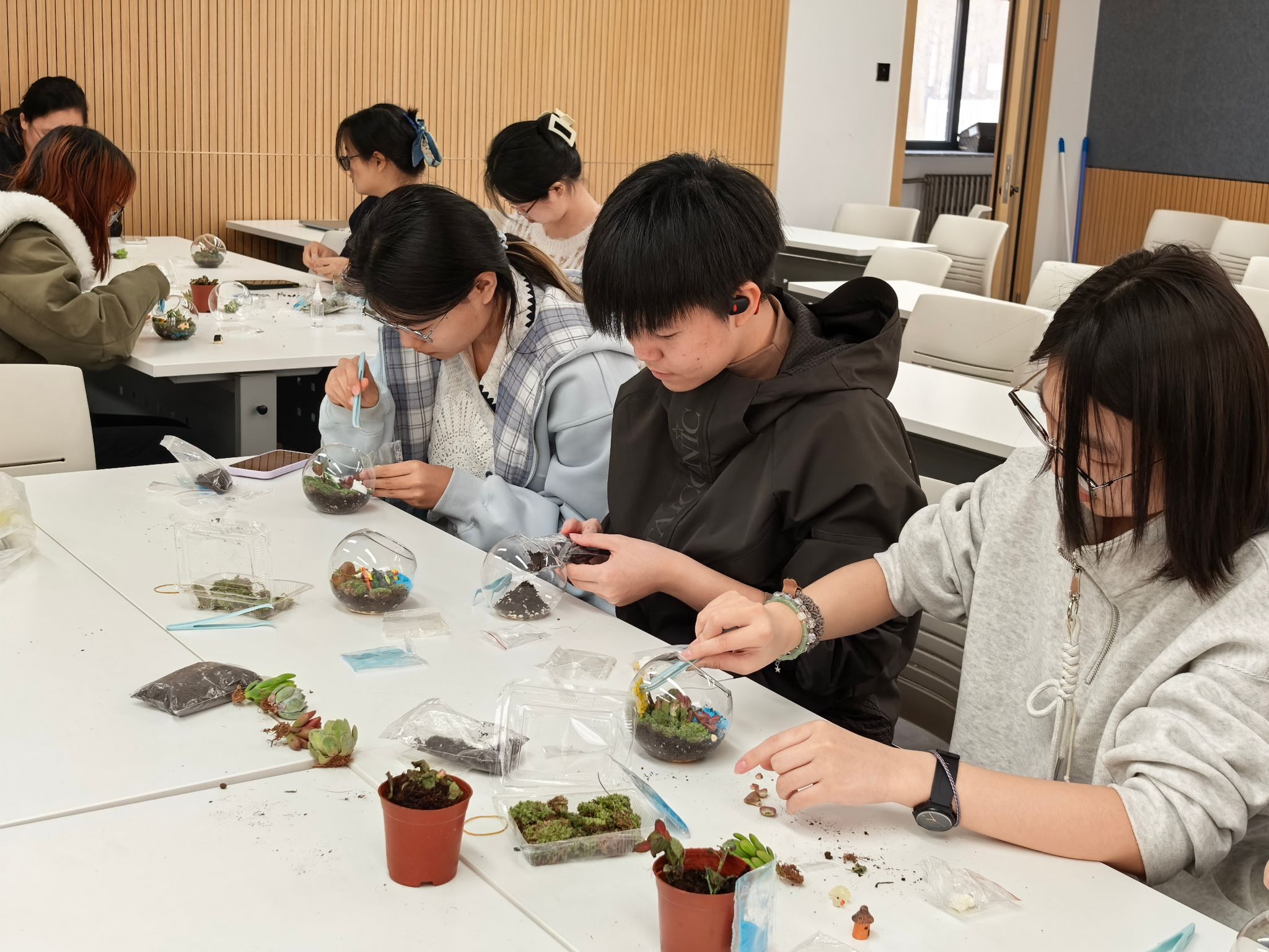 讲解完毕,绿植微景观的创作环节正式开启。同学们充分利用现场准备的玻璃瓶、石子、营养土,以及多肉、苔藓等绿植,搭配各式各样的创意摆件和制作工具,开启了属于自己的春日方寸天地创作。