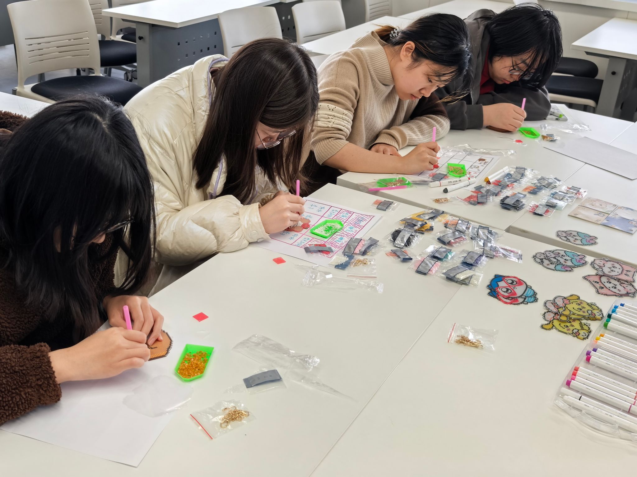 随后的“钻石挂件挑战赛”环节充满趣味与专注感。同学们静心凝神,用工具细致拼装钻石图案,在沉浸式创作中体验专注做事的充实感与完成目标的成就感,深刻体会合理规划、立即行动、专注当下的重要意义。
